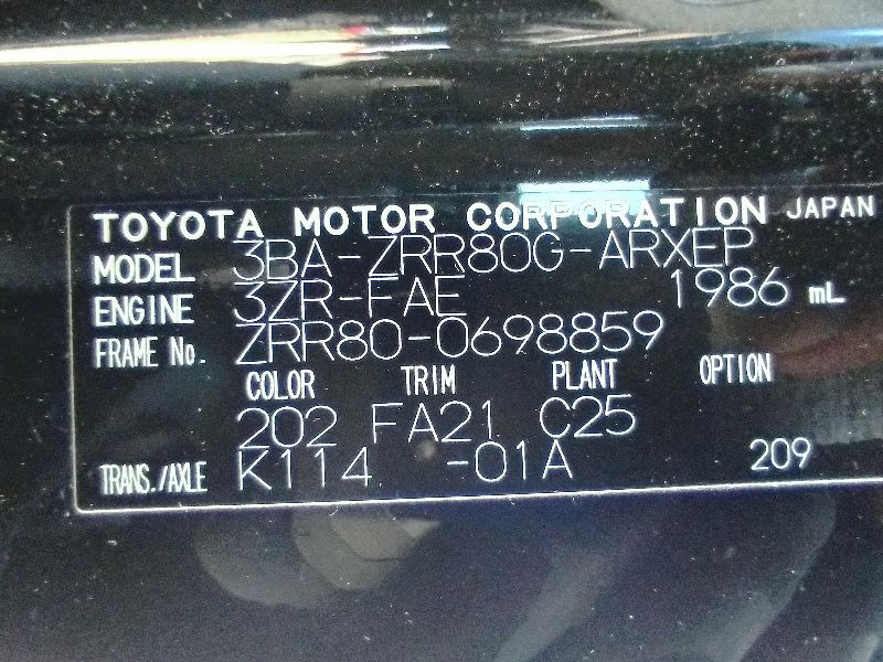 | Chassis No | ZRR80-0698859 | Chassis Code | 3BA-ZRR80G |