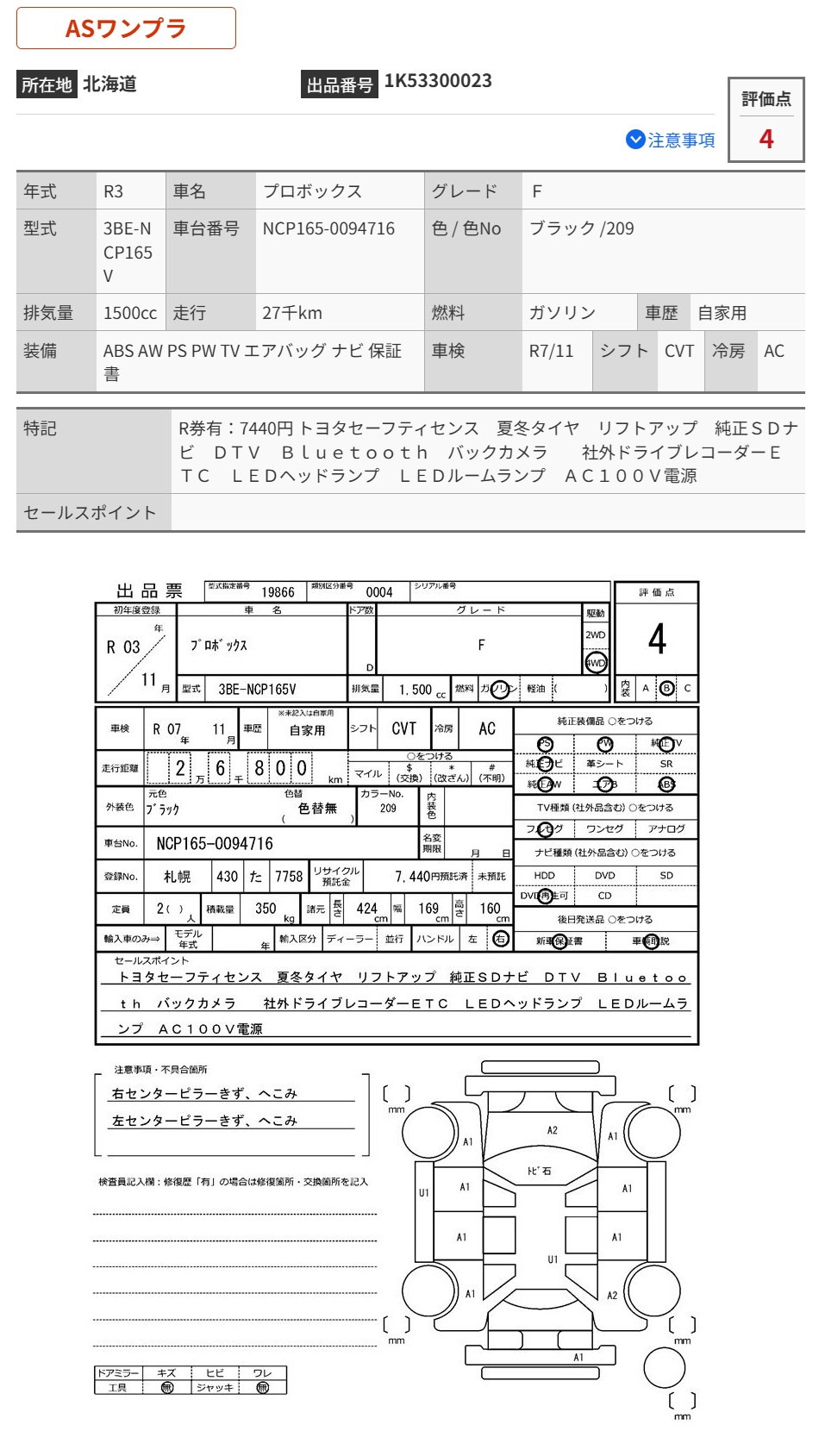 | Vehicle Name | PROBOX | Auction Points | 4/B |